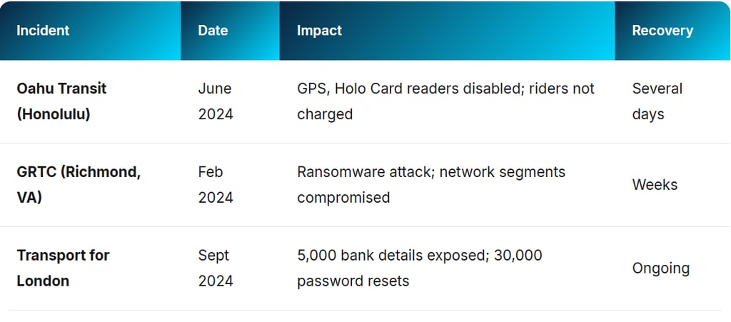 These weren't sophisticated nation-state attacks. They were opportunistic ransomware and phishing campaigns that succeeded because transit systems presented soft targets with inadequate defenses.