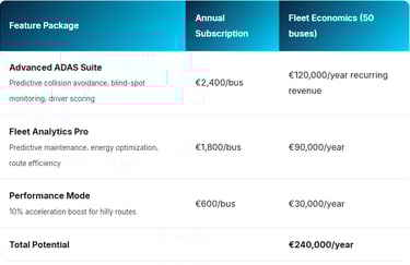 Daimler Buses (EvoBus): eCitaro electric platform already features OTA updates for battery management and vehicle control systems. 2,800+ buses deployed with remote update capability. Subscription services launched in 2024: Fleet Analytics Pro (€1,800/bus/year).